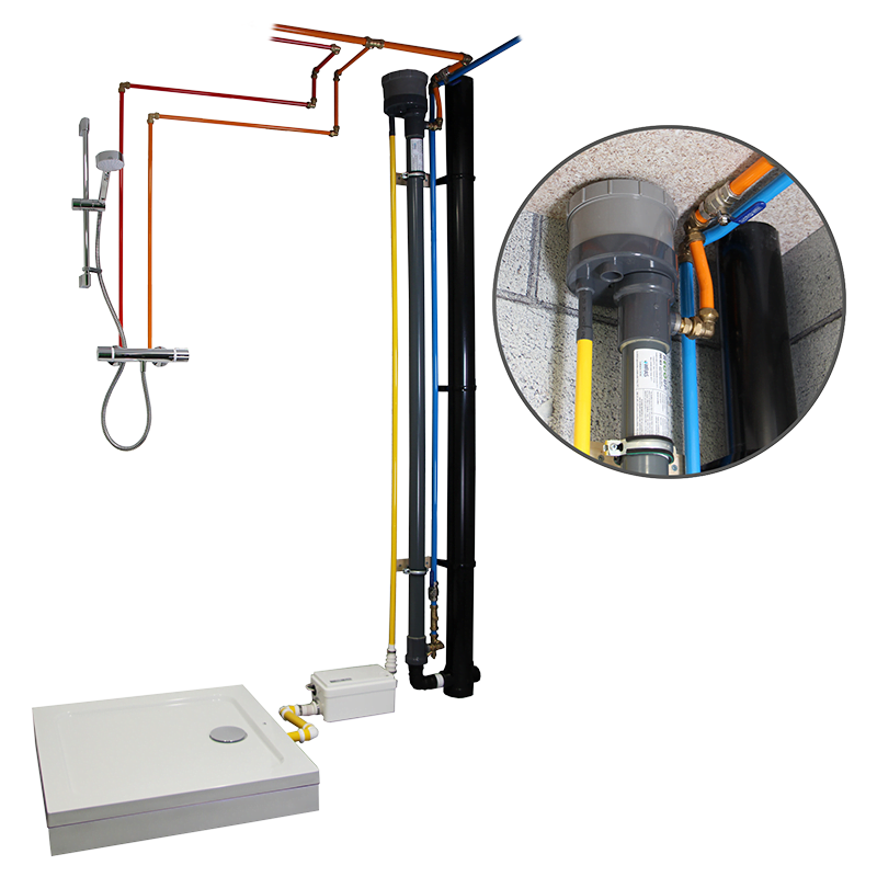 The Pipe HEX Active, a pumped version of the Pipe HEX allowing for the highest efficiency system to be installed on the same floor as the shower, was fitted into the 1990s detached house. A cupboard behind the ensuite provided enough ceiling height, so no alterations to the ceiling space were needed. Shower waste was routed through the wall to the pump and back from the bottom of the Pipe HEX to the SVP. Some extra pipe supports and the ability to completely isolate the system were added because the home is part of a demonstration site; these wouldn’t normally be needed in a regular installation.